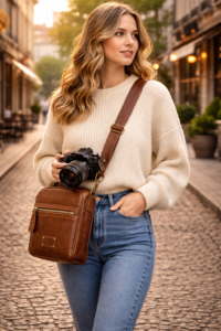 Here’s why it works so well. A leather camera bag crossbody sits diagonally across your body, resting at your hip or chest. That means your hands are always free. You’re not constantly putting down a bag to grab your camera. You just reach in, pull out, and shoot. In fast-moving environments — markets, festivals, busy streets — that speed matters enormously.